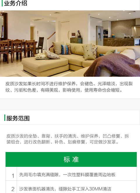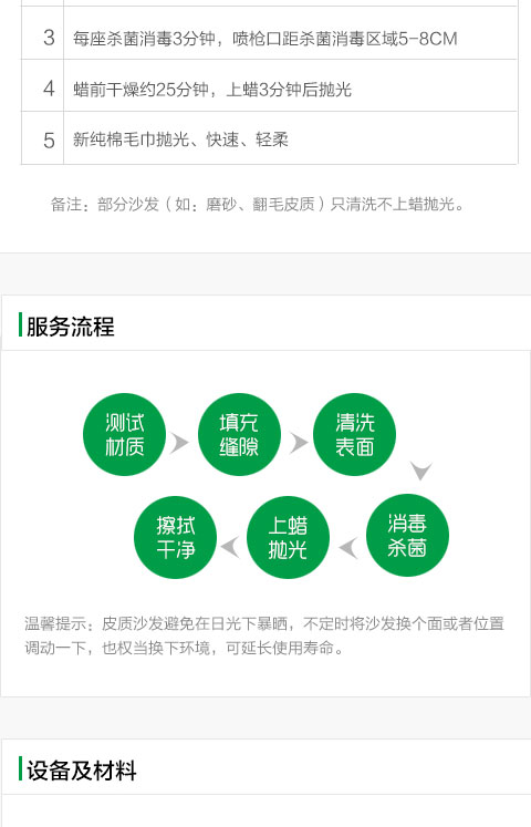 皮質區域、面積、同材質沙發背部或底部10cm2。沙發表面機器清洗,縫隙處手工深入30mm清潔。 殺菌消毒每座3分鐘,噴槍口距殺菌消毒區域5-8cm。 上蠟前干燥約25分鐘,上蠟3分鐘后拋光。新純棉毛巾拋光、快速、輕柔。