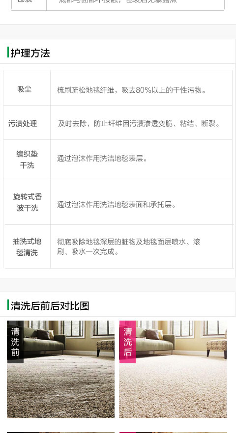清潔二次,第一次每平方米5分鐘,第二次每平方米3分鐘。 每次清洗后吸水兩遍。晾干——避免陽光直射超過8小時,防止褪色。防靜電——拋毛處理一次,每平方米30秒。 殺菌——每平方米均勻噴灑殺菌液1毫升左右。包裝——底部與面部不接觸,包裝后無任何暴露點。