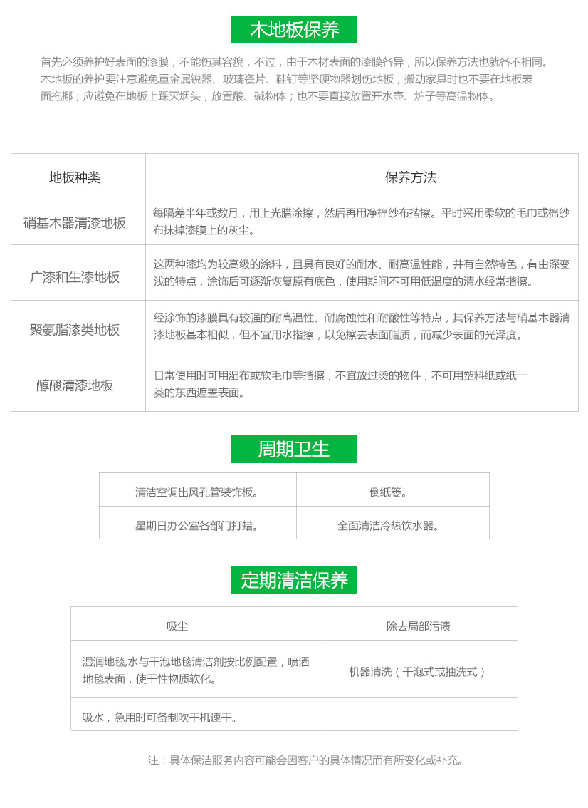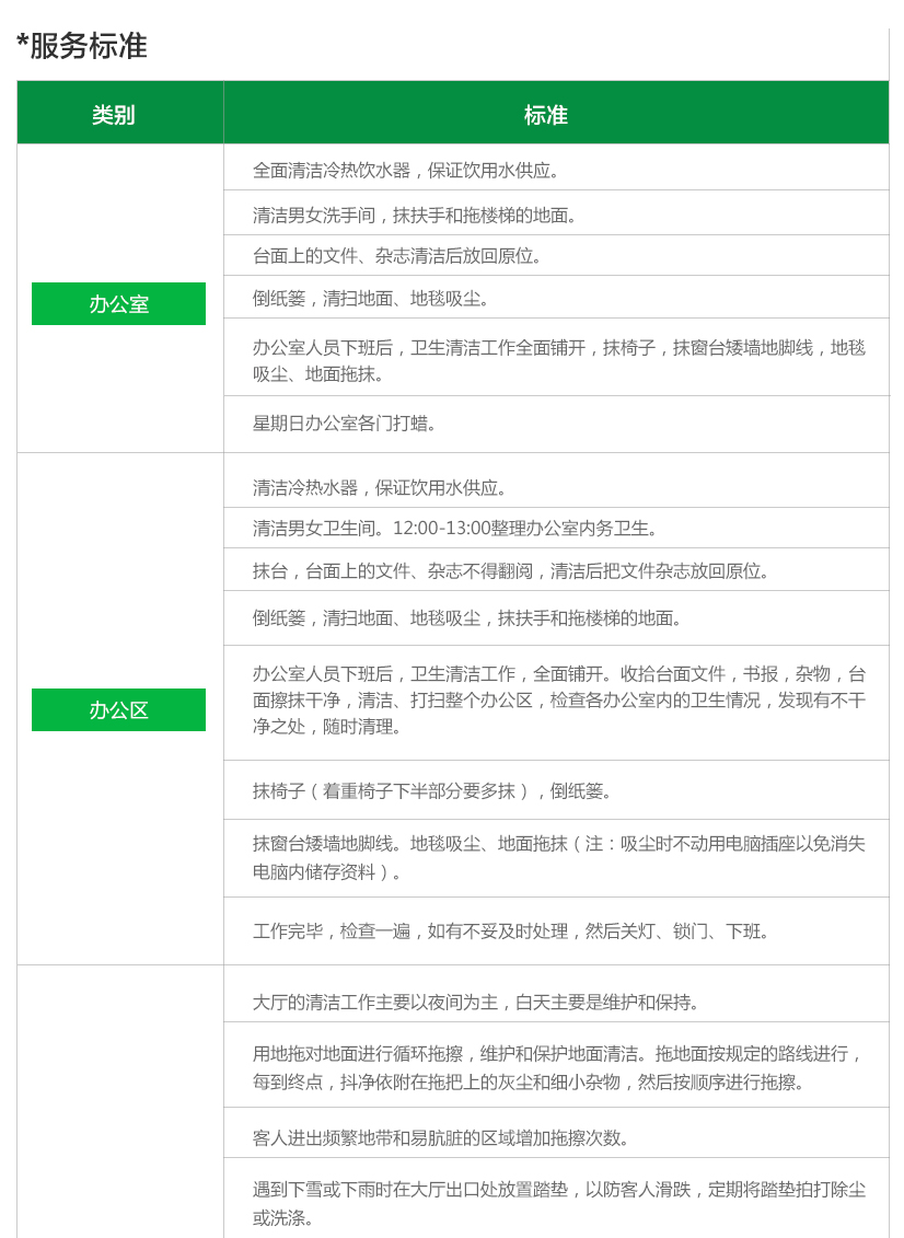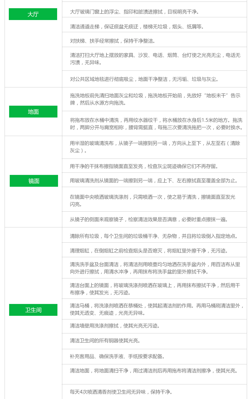 人員按程序、有計劃地對指定區(qū)域全天或定期地進(jìn)行清潔養(yǎng)護(hù)。